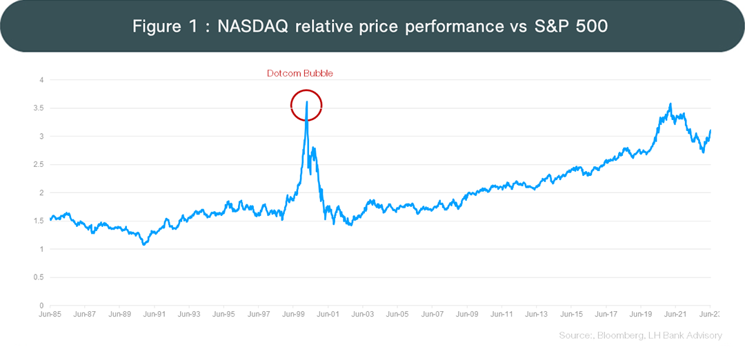 ในยุคที่ธนาคารกลางของสหรัฐฯ ใช้มาตรการผ่อนคลายเชิงปริมาณทางการเงิน (Quantitative Easing) และอัตราดอกเบี้ยที่ต่ำทั่วโลก ทำให้ธุรกิจสามารถเข้าถึงแหล่งเงินทุนได้ง่ายขึ้นด้วยต้นทุนทางการเงินที่ต่ำมาก จึงทำให้เกิดการวิจัยและพัฒนานวัตกรรมและเทคโนโลยีใหม่ๆ ขณะที่ในปีที่ผ่านมา ผลกระทบของเงินเฟ้อและการปรับขึ้นดอกเบี้ยของธนาคารกลางทั่วโลก ส่งผลให้ราคาหุ้นโดยเฉพาะกลุ่มเทคโนโลยีปรับตัวลง ส่วนการปรับตัวขึ้นของราคาหุ้นเทคในปีนี้ มาจากศักยภาพของ AI ซึ่งช่วยให้ประหยัดเวลาและลดต้นทุนในการผลิต ทำให้การดำเนินธุรกิจมีประสิทธิภาพมากขึ้น อย่างไรก็ตาม ทาง LH Bank Advisory มองว่าจะต้องระมัดระวังการลงทุนในระยะสั้นในหุ้นกลุ่มที่ได้ประโยชน์จาก AI เนื่องจากราคาหุ้นในกลุ่มนี้ขึ้นมามากแล้ว จนเข้าสู่ภาวะ Overbought ทำให้หุ้นมีโอกาสปรับฐาน จึงน่าจะใช้เป็นจังหวะในการขายมากกว่า และแม้ว่าการทะยานขึ้นของราคาในรอบนี้จะมาจากการเพิ่มประสิทธิภาพของอุตสาหกรรมการผลิตของ AI และโอกาสในการเติบโตต่อไป แต่หากราคายังปรับตัวขึ้นต่อไปก็อาจเข้าสู่ภาวะฟองสบู่ได้ในอนาคต 1-3 ปีข้างหน้า