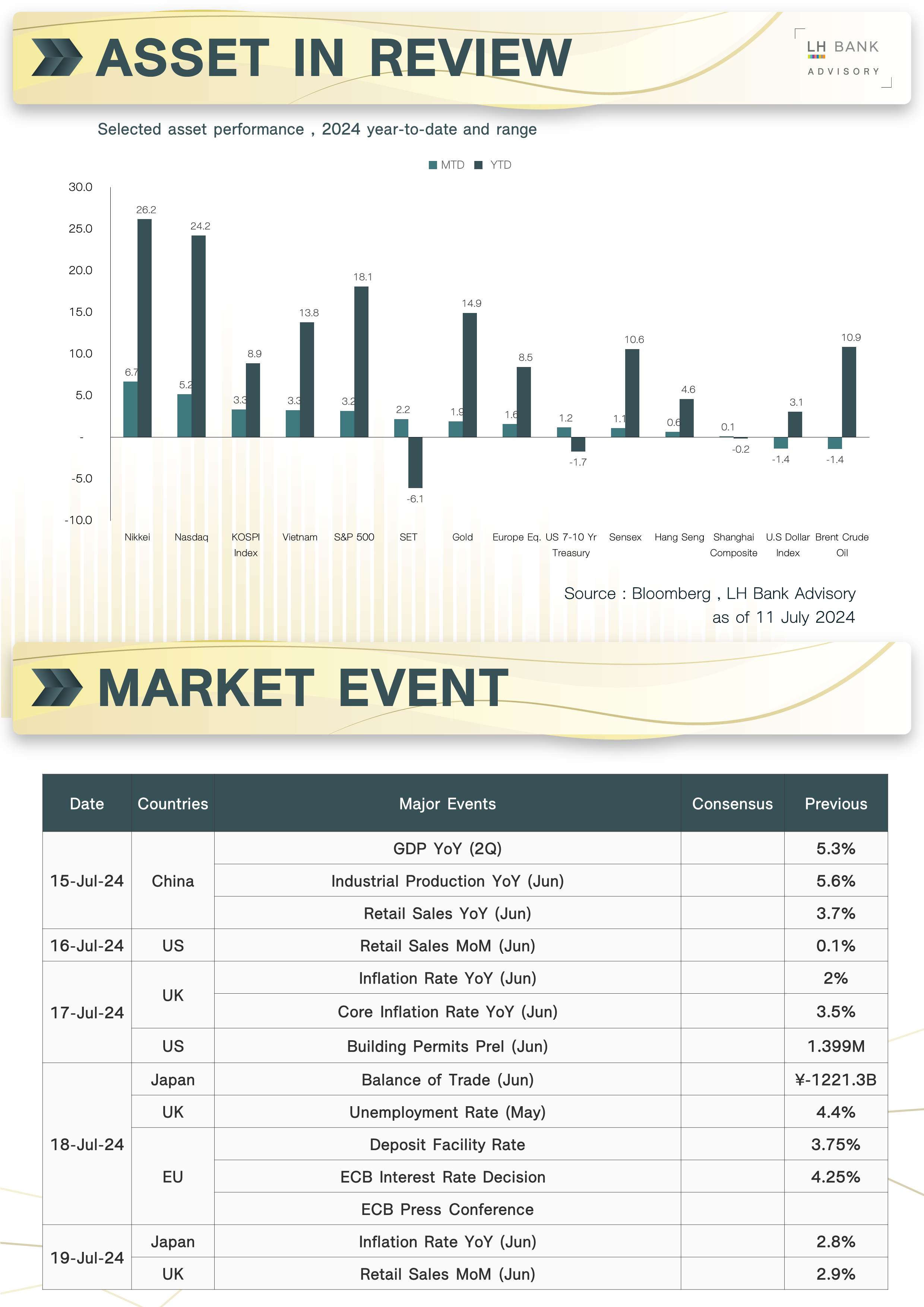 Gold rallies as Fed rate cut expectations rise ราคาทองคำปรับตัวขึ้น แตะระดับ 2,400 ดอลลาร์ต่อออนซ์ หลังจากประกาศอัตราเงินเฟ้อ CPI เดือน มิ.ย. เพิ่มขึ้น 3%YoY ต่ำกว่าที่ตลาดคาดการณ์ ขณะที่ค่าเงินดอลลาร์อ่อนค่าแตะระดับ 104 จุด โดยได้รับแรงหนุนจากความคาดหวังในการลดอัตราดอกเบี้ยใน จาก CME FedWatch Tool เพิ่มน้ำหนักการลดอัตราดอกเบี้ย 25bps ในเดือน ก.ย. นี้ ประกอบกับตัวเลขอัตราว่างงานเดือน มิ.ย. ที่เพิ่มขึ้นเป็น 4.1% และการจ้างงานนอกภาคการเกษตรที่มีแนวโน้มชะลอตัวลง ตอกย้ำ Fed อาจลดอัตราดอกเบี้ยได้ตามคาด อย่างไรก็ตามทาง LH Bank Advisory ประเมินว่าการลดอัตราดอกเบี้ยจะมีแนวโน้มยืดเยื้อออกไป ซึ่งเป็นปัจจัยกดดันต่อราคาทองคำ