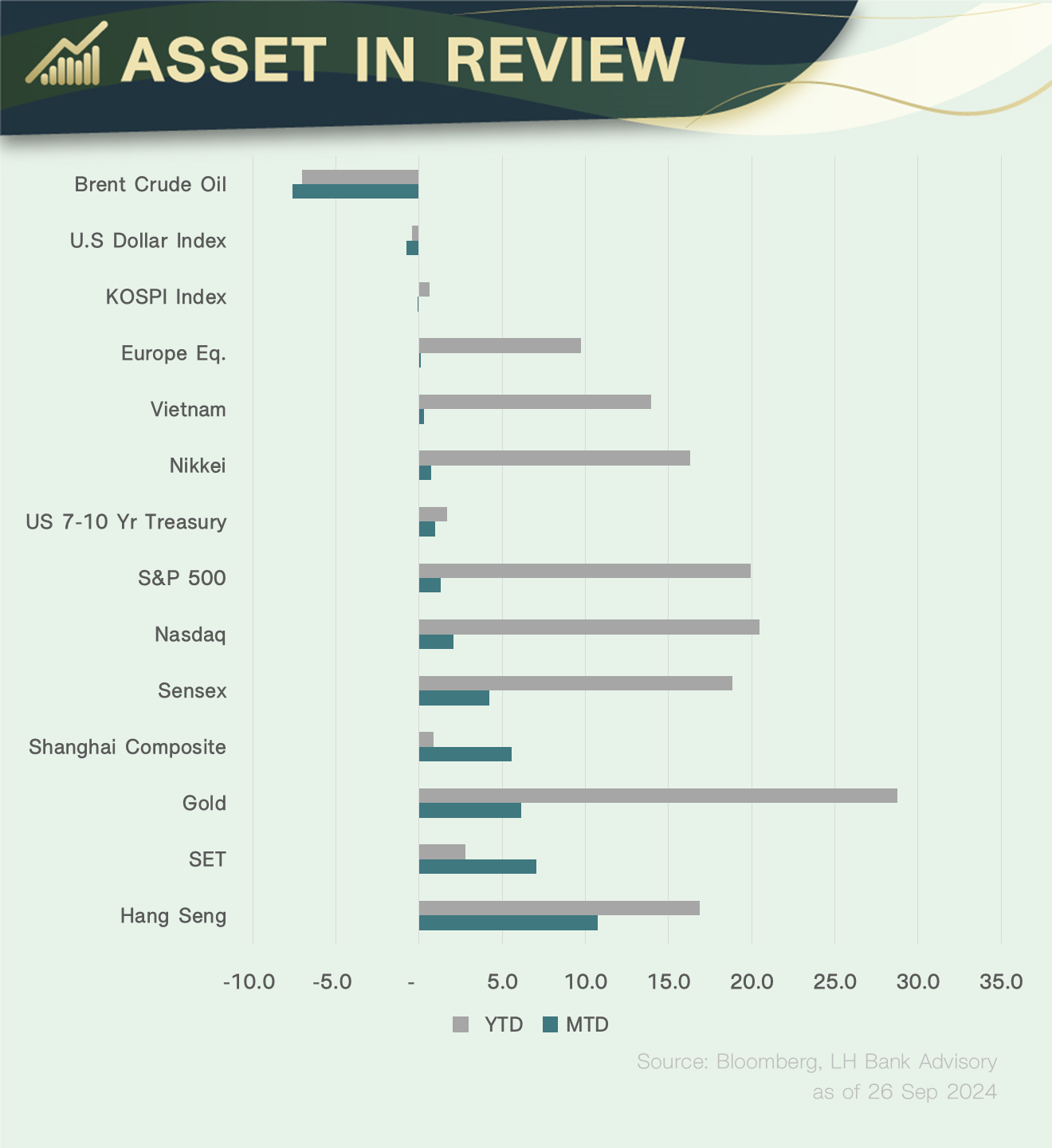 หลังจากธนาคารกลางสหรัฐฯ ปรับลดอัตราดอกเบี้ยลง 0.5% ครั้งแรกในรอบ 4 ปี และส่งสัญญาณผ่าน Fed Dot Plot ว่าจะปรับลดดอกเบี้ยอีก 0.5% ภายในสิ้นปีนี้ และลดอีก 1% ในปี 2025 สะท้อนการตอบรับต่อความอ่อนแอของตลาดแรงงาน ที่อาจส่งผลกระทบต่อภาวะเศรษฐกิจและโอกาสเกิดเศรษฐกิจถดถอยได้ในอนาคต ทางเราจึงแนะนำลดสัดส่วนของหุ้นกลุ่มเทคโนโลยี และเพิ่มสัดส่วนในตราสารหนี้ระยะกลางถึงยาวและเน้นหุ้นคุณภาพที่มีความผันผวนต่ำ โดยมีกลยุทธ์สำหรับเดือนตุลาคมไว้ดังนี้