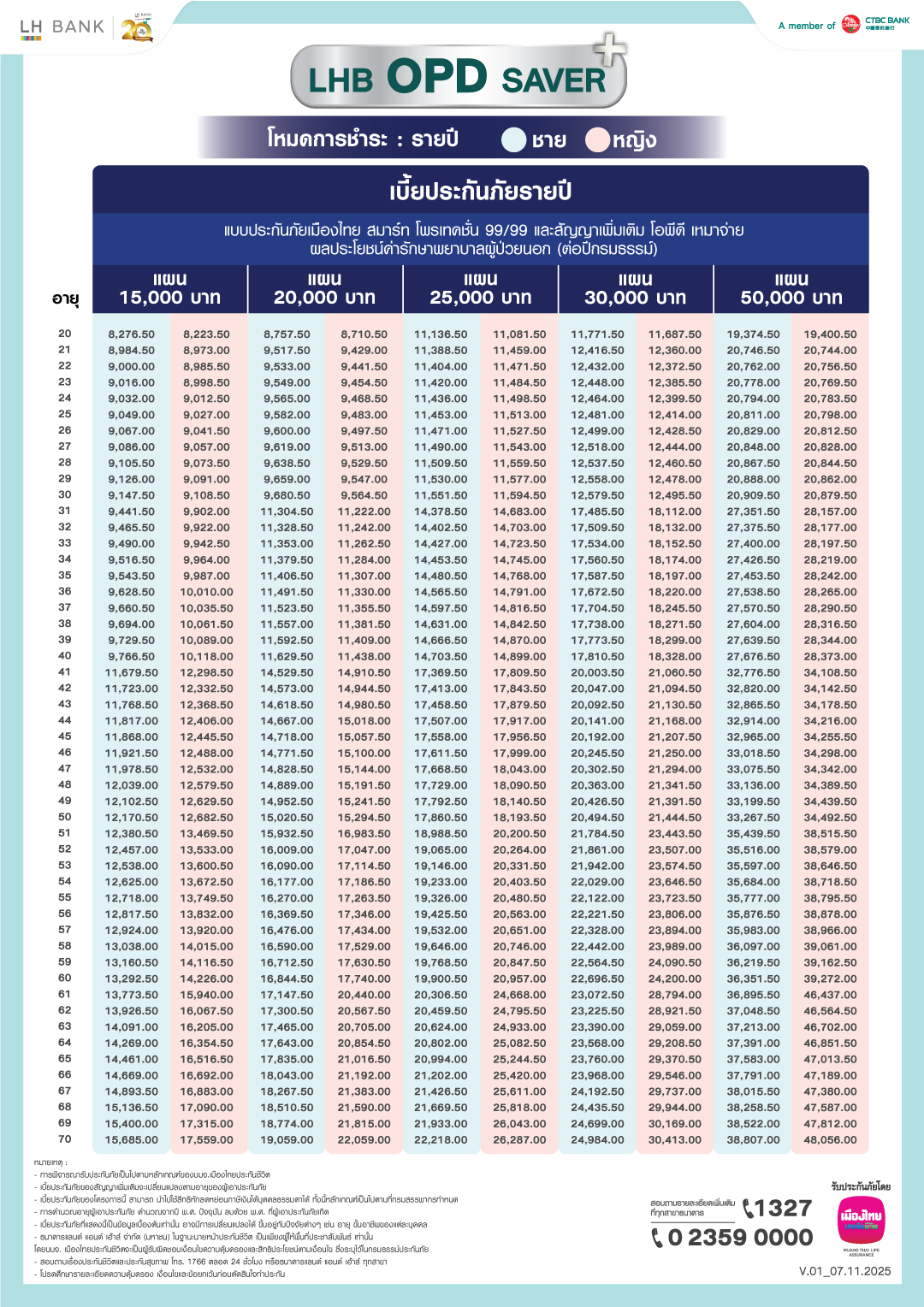 ตารางแสดงผลประโยชน์ของสัญญาประกันภัยหลัก