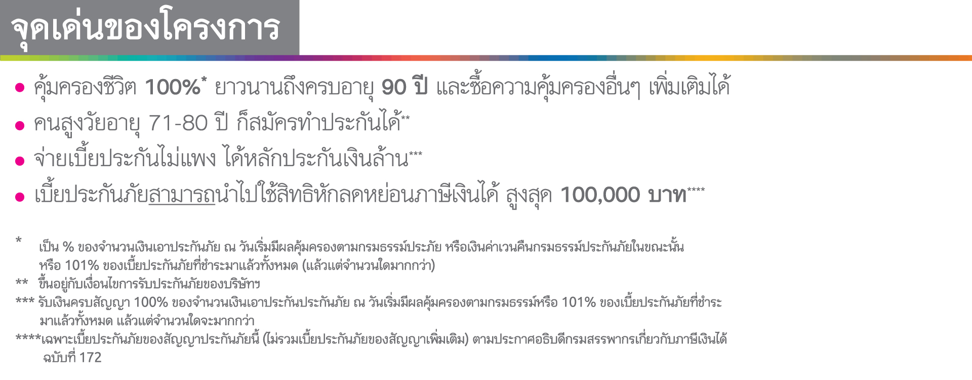 ส่วนหนึ่งส่วนใดของสัญญาประกันภัย เพื่อประโยชน์สูงสุดผู้ขอเอาประกันภัยควรศึกษา อ่าน และ ทำความเข้าใจข้อมูลเพิ่มเติมในกรมธรรม์