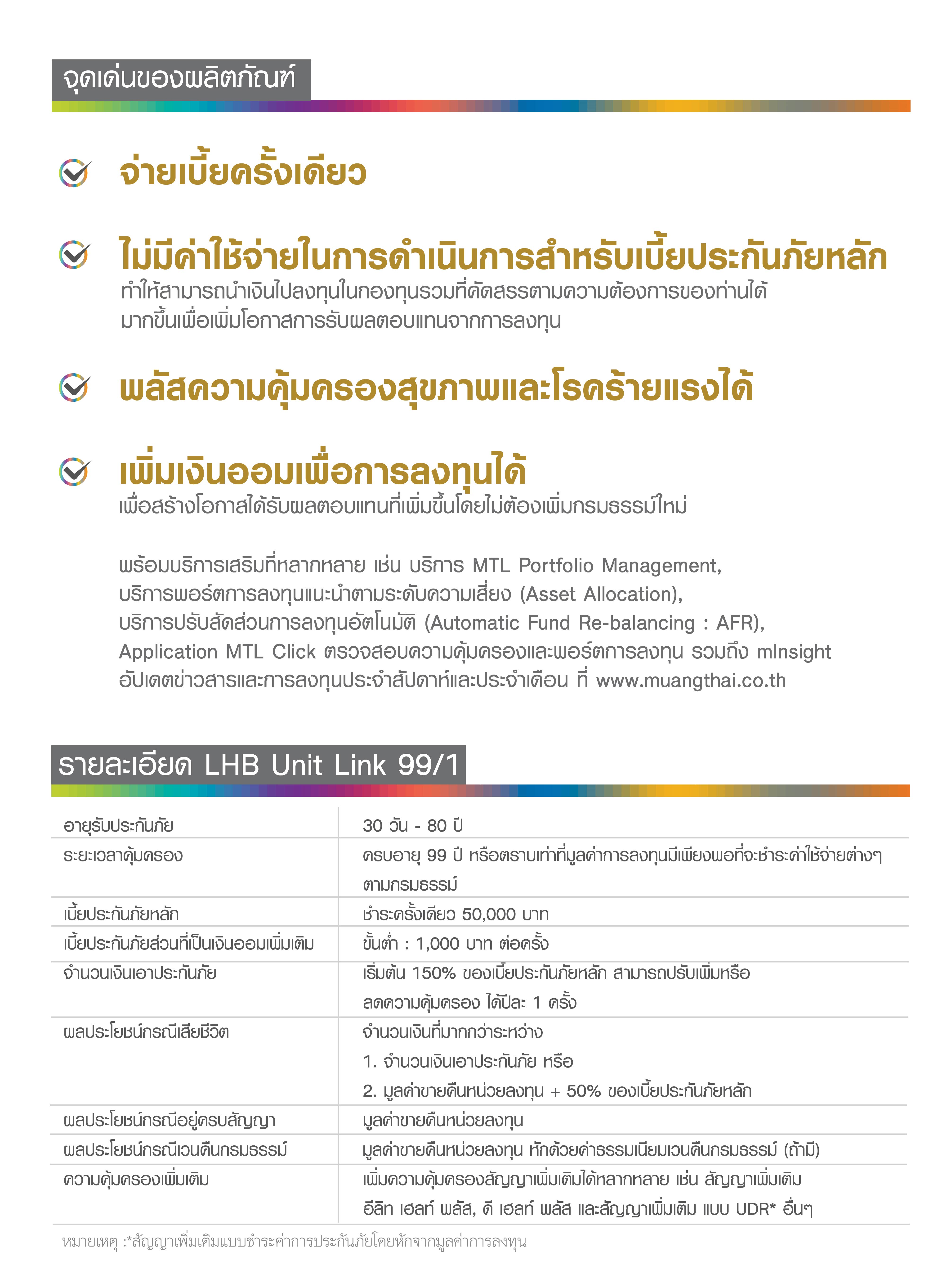 - “LHB UNIT LINK 99/1” เป็นชื่อทางการตลาด โดยชื่อทางการที่ได้รับอนุมัติจาก คปภ. คือ “แบบประกันภัยเมืองไทยยูนิตลิงค์ 2 (ชำระเบี้ยประกันภัยครั้งเดียว)”