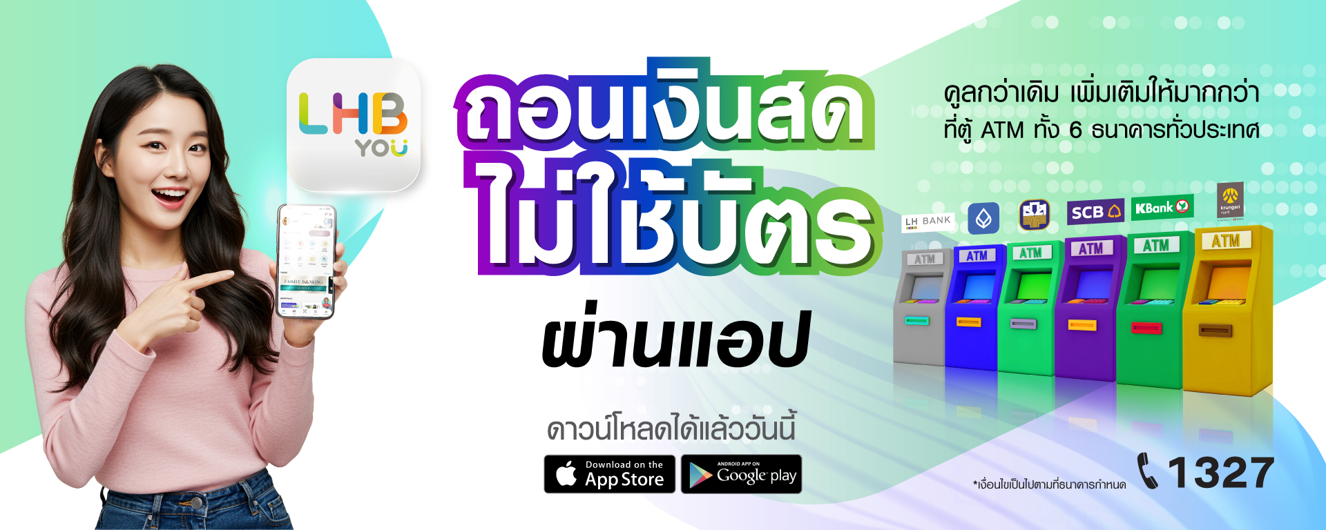 วันนี้! ถอนเงินสดไม่ต้องใช้บัตร ATM สะดวกง่ายกว่าที่เคย เพียงทำรายการผ่านแอปพลิเคชัน LHB You ที่ตู้ ATM ธนาคารไทยพาณิชย์ ที่ตู้ ATM ธนาคารเพื่อการเกษตรและสหกรณ์การเกษตร ที่ตู้ ATM ธนาคารกสิกรไทย ที่ตู้ ATM ธนาคารกรุงเทพ และที่ตู้ ATM ธนาคารกรุงศรีอยุธยา ซึ่งมีให้บริการกว่า 37,000 ตู้ ทั่วประเทศ